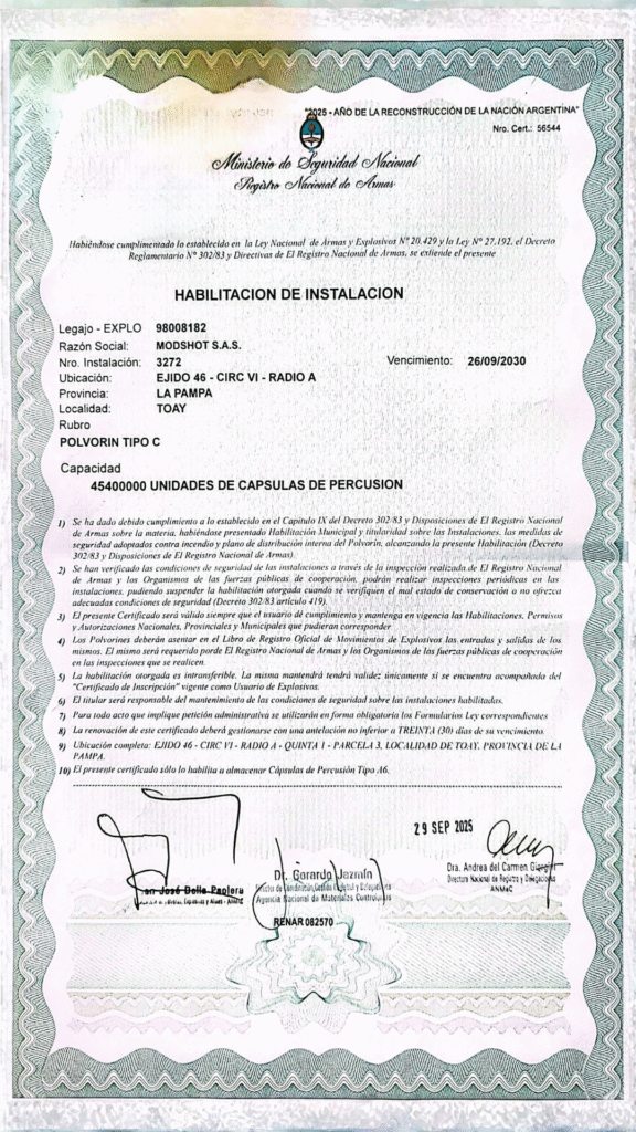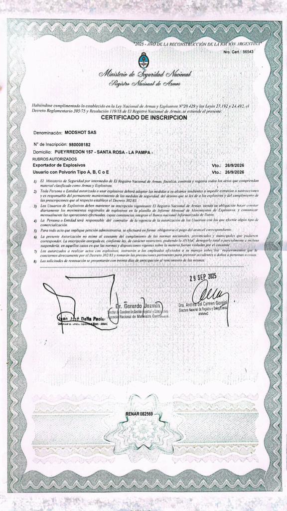 • Cliente: MODSHOT S.A.S CUIT 30-71860240-4 – Legajo Explosivo 98008182 – Nro Instalación 3272.